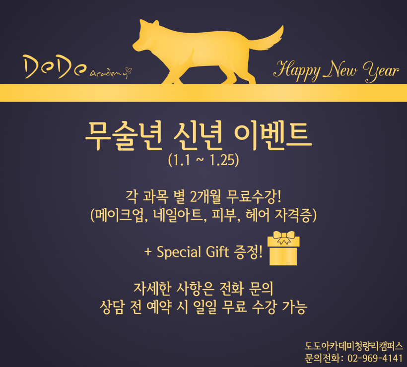 [이벤트] [ 1월 이벤트 ] 무술년 신년 이벤트 각 과목 별 2개월 무료수강! 페이지 정보 작성자 도도아카데미 작성일18-01-23 11:48 조회1,462회 댓글0건 이전글 다음글 목록 본문 자세한 사항은 전화문의바랍니다^^ 02-969-4141 이전글 다음글 목록